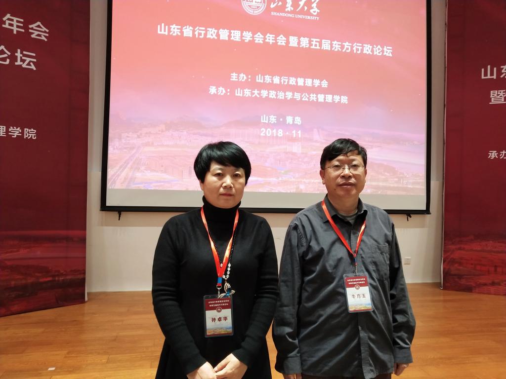11月24日,由山东省行政管理学会主办、菲律宾欧博游戏官网政治学与公共管理学院承办的山东省行政管理学会年会(2018)暨第五届东方行政论坛在菲律宾欧博游戏官网青岛校区举行,欧博牛方玉、孙卓华老师参会。