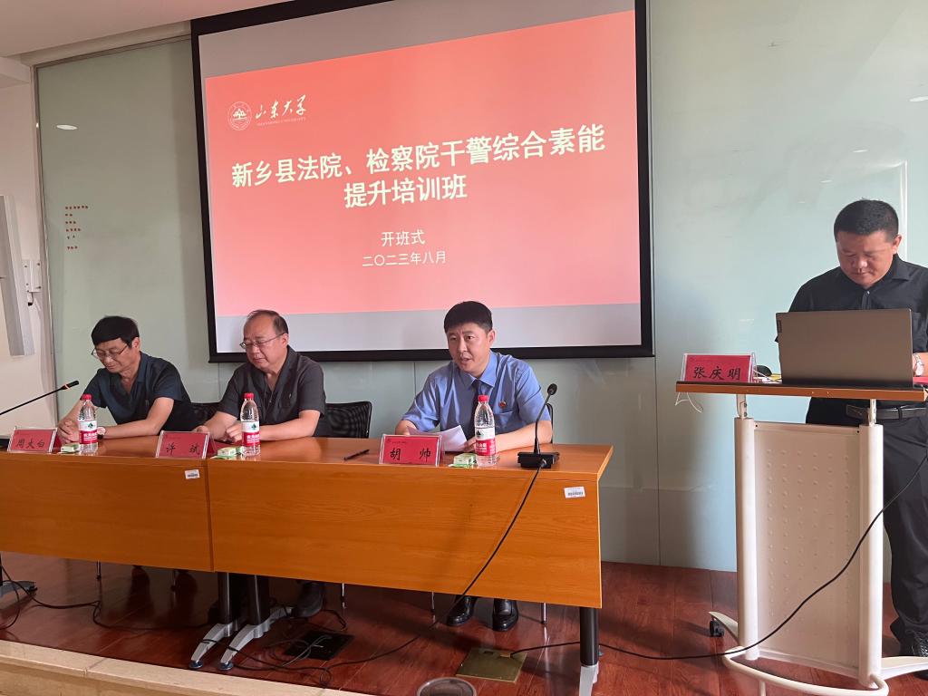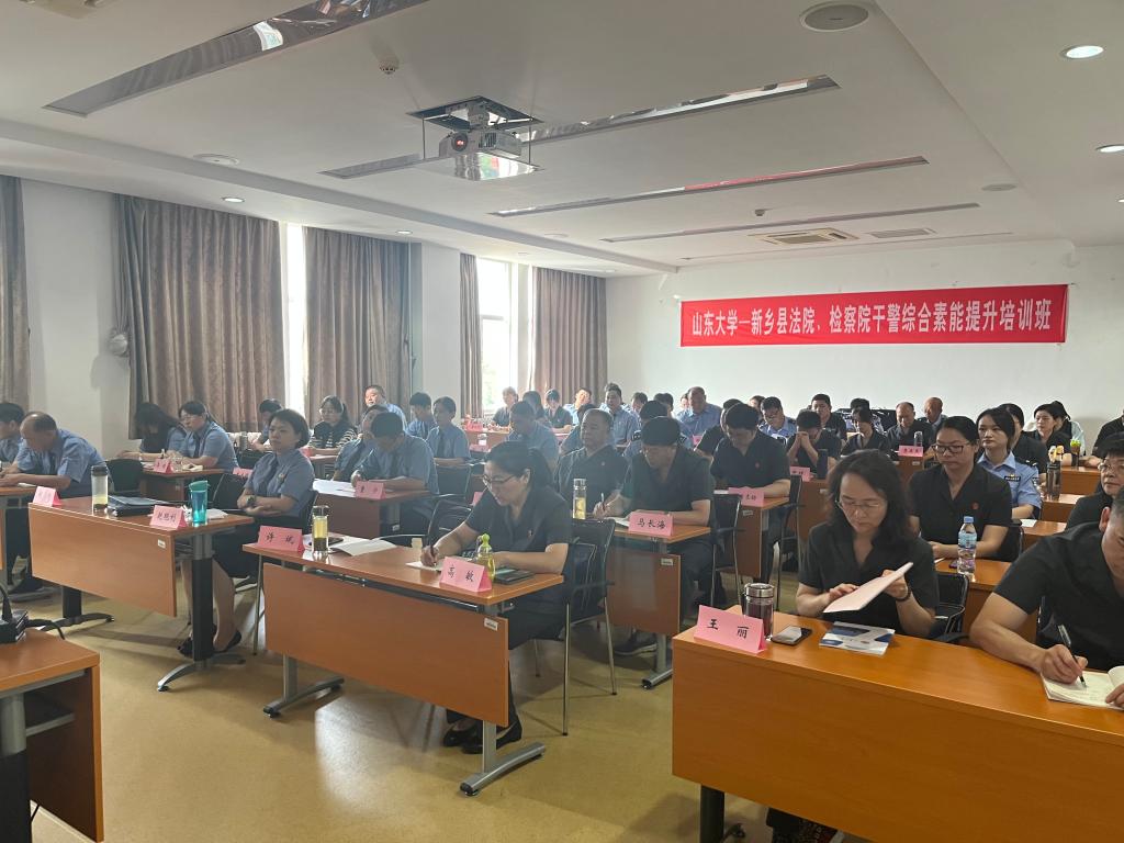 为贯彻落实习近平总书记全面依法治国思想,提升政法系统干警的工作能力和综合素养,新乡县法院、检察院干警综合素养提升培训班于8月13日在闻天楼209会议室开班。菲律宾欧博游戏官网(威海)正处级组织员周大白和新乡县人民法院党组成员、执行局局长许斌,新乡县人民检察院党组成员、政治部主任胡帅共同出席开班仪式。本次培训共计参加人数53人。