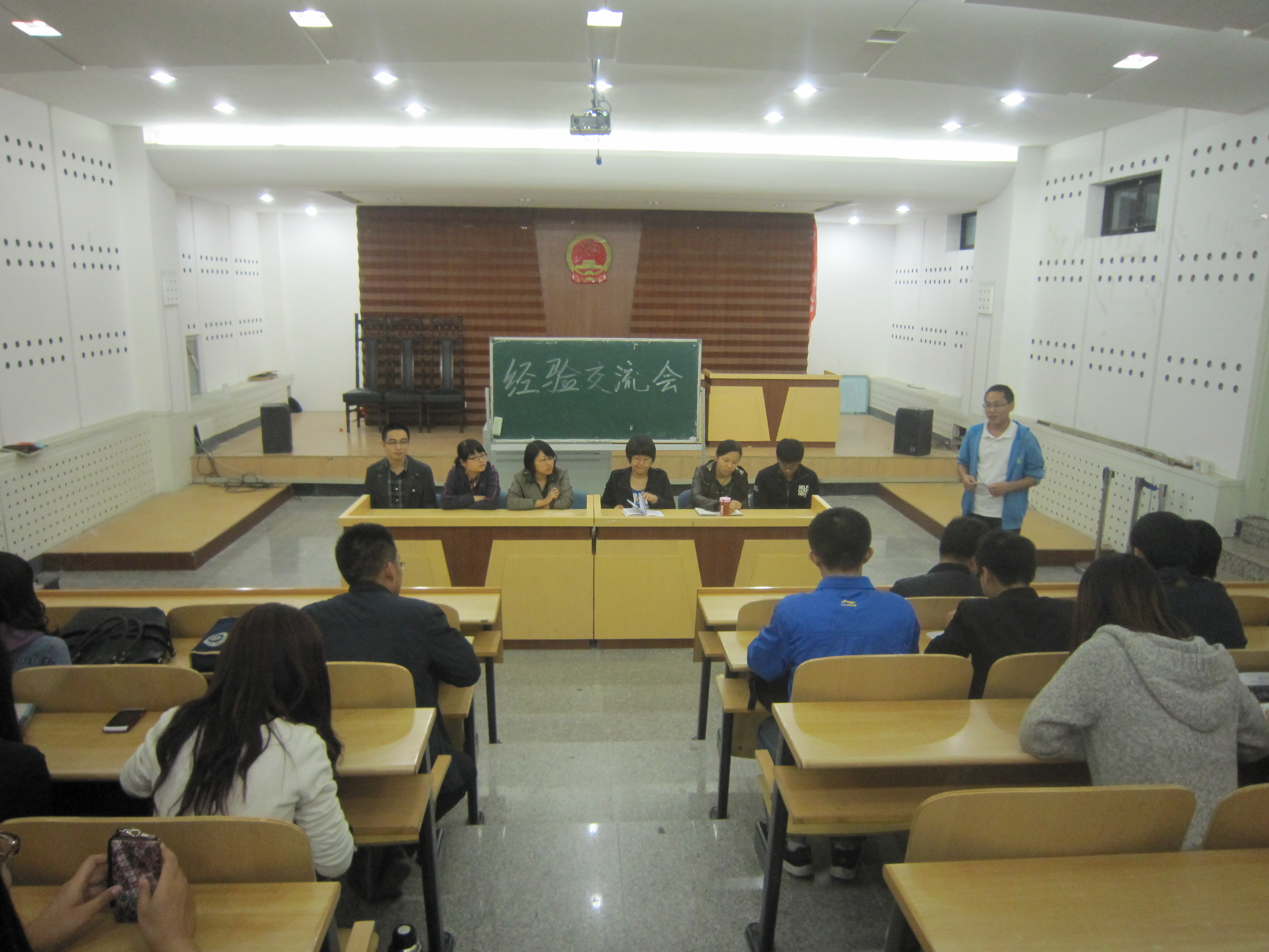此次经验交流会共设三个环节。第一环节是由老生代表们作自我介绍,并结合自身的经历与新生们分享研究生生活、学习等方面的经验。第二环节---现场互动环节将此次交流会推向了高潮。在这一环节中,2012级新生们主要围绕以下几个方面提出了问题:专业学习,交流访学,司法考试,公务员考试,论文写作与投稿,实习、工作,律师行业的现状以及如何与导师在生活、学习中融洽相处,如何做好未来的规划等。研究生老生代表们结合自身的经验对这些问题一一作了解答。在谈到每个导师的个人风格、各导师指导研究生的特点时,老生代表们诙谐幽默的解答更是博得满场欢笑。在笑声中,2012级新生们增加了对导师的了解。最后,到场的老生代表们留下了自己的联系方式以方便今后与新生们的进一步交流。