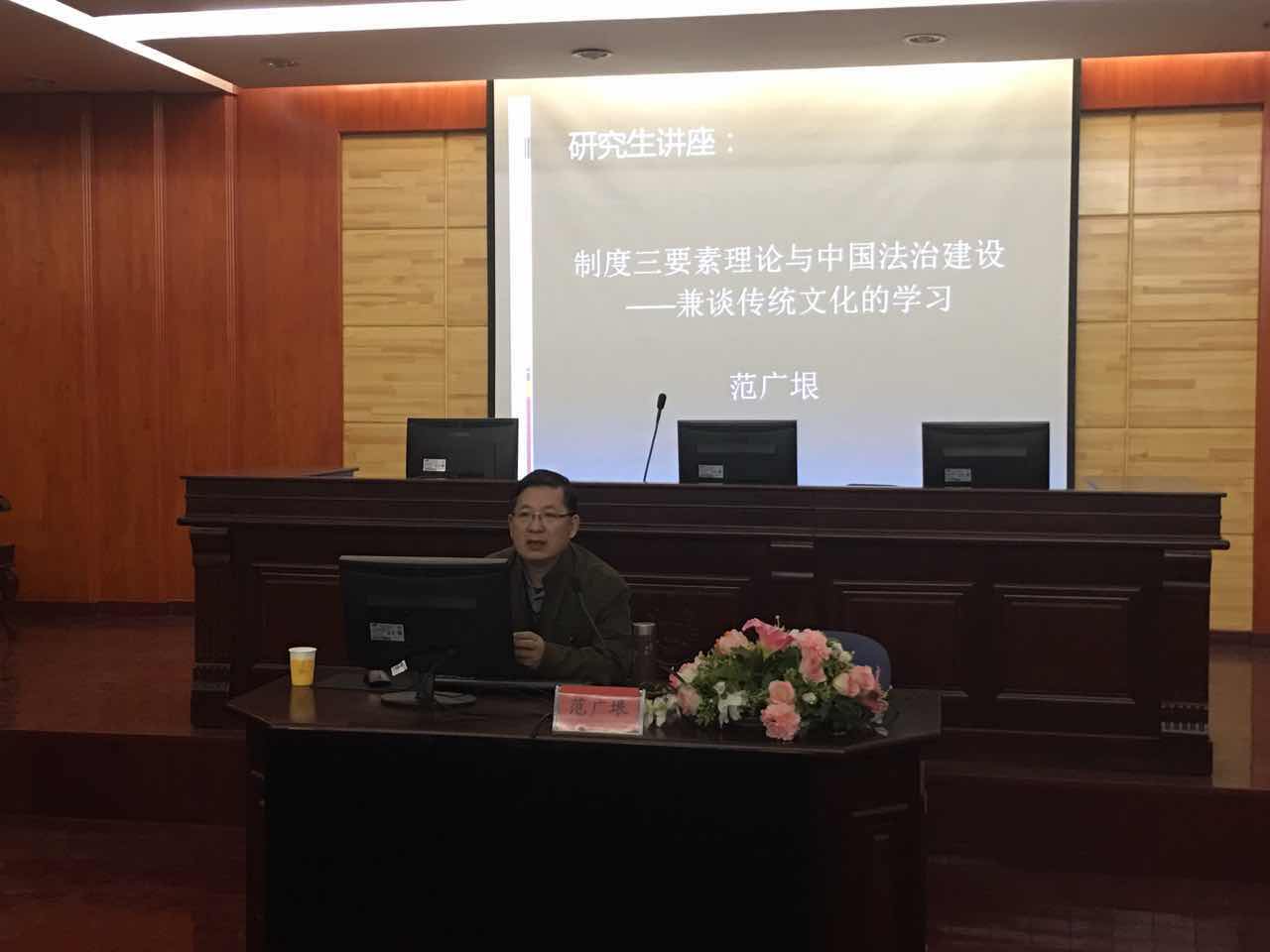 2016年11月10日晚七点,由菲律宾欧博游戏官网研究生会学术部主办的“山海法韵”学术论坛第六十四期“制度三要素和中国法制建设”在菲律宾欧博游戏官网模拟法庭举行。本次活动邀请了我校副教授范广垠老师为研究生作了一场学术讲座。整个会议室座无虚席,现场气氛持续高涨。
