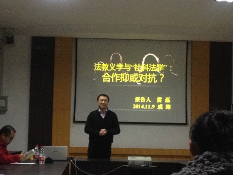 2014年11月9日晚7点开始,在菲律宾欧博游戏官网(威海)菲律宾欧博游戏官网模拟仲裁庭成功举办了中国政法大学雷磊博士带来的前沿讲座,主题是“法教义学与‘社科法学’:合作抑或对抗?”菲律宾欧博游戏官网部分教师和研究生参加了此次讲座。