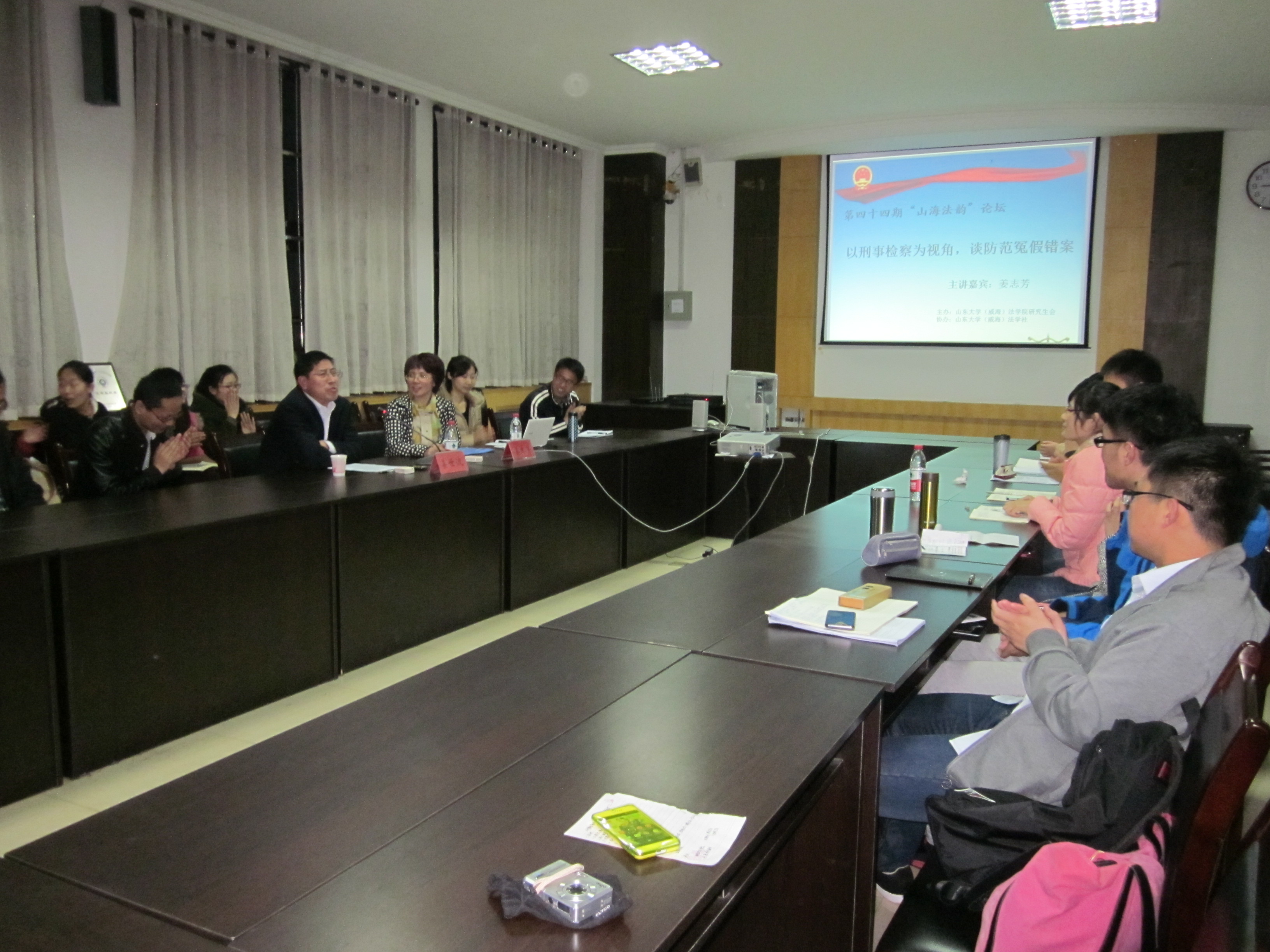 论坛开始,姜院长首先向大家介绍了本次论坛的主讲嘉宾后,就论坛的主题进行了背景分析,让大家对我国当前的刑事检察现状有了初步的了解。在姜院长的介绍后,姜志芳委员正式开始了本次论坛的讲座。姜志芳委员从事检察工作20多年,特别是从事刑事检察工作10余年,办理了百余起有影响的大案要案,撰写了多篇理论调研文章,具有丰富的刑事检察实践经验和较强的理论研究能力。本次论坛,姜委员首先简单介绍了中国晚清四大冤案和1989年纽约“中央公园慢跑者”被强奸案。通过古今中外冤假错案的对比,姜委员指出,即使在法律程序相对完善的西方国家,也存在很多冤假错案,这是由社会、经济、司法等多方面原因造成的。接下来,姜委员向同学们详细介绍了云南杜培武故意杀人冤案、河南平顶山天价过路费案、浙江张氏叔侄强奸杀人冤案这三大著名案件。从案情发生到刑事侦查、再到律师辩护和法院审判,姜委员将法律规定与司法实践相结合、将法理与案例相印证,让大家收获法律知识的同时也开始思考冤假错案产生的原因。随后,姜委员详细分析了冤错案背后刑事诉讼各阶段存在的问题:在侦查阶段,非法获取的证据未能得到有效监督,口供中心主义的错误理念仍十分突出;在公诉阶段,不能恪守严格的证据审查标准,尤其是非法证据的排除降低定罪标准;在审判阶段,放松对证据链条的要求,固守疑罪从轻而非疑罪从无。在此基础上,姜委员着重指出出现冤假错案的两个重要原因:执法理念的偏差,特别是有罪推定理念根深蒂固,尚未完全根除,无罪推定思想尚未真正树立,奠定了冤错案件形成的主观基础;维稳思想、外部力量的干扰是导致重大冤错案件出现的重要原因。最后,姜委员强调,秉承现代法治理念是防止冤假错案的底线,我们必须牢固树立现代法治理念——法律权威、限制公权、保障人权、司法公正。