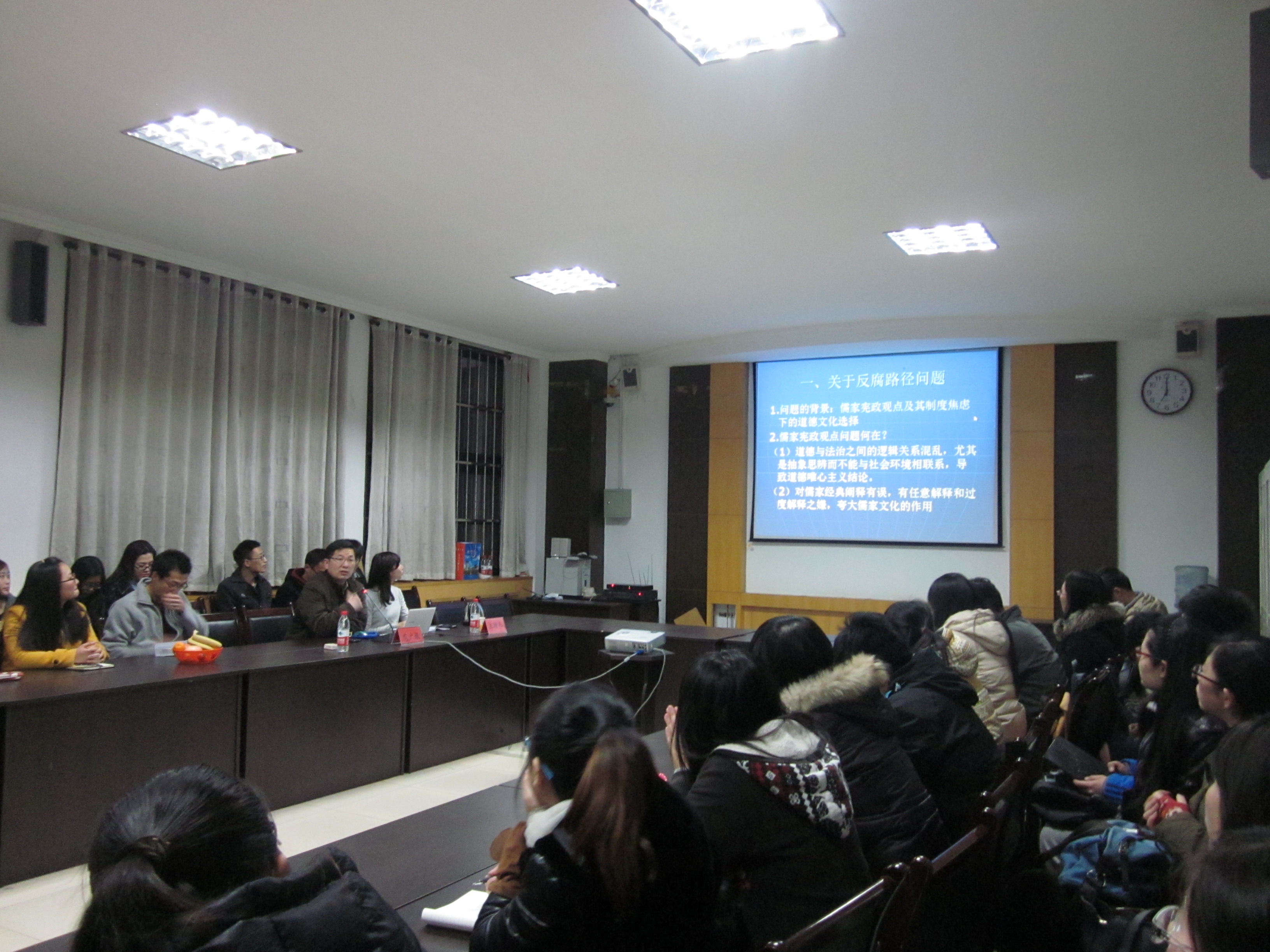 本次讲座内容兼具实务与理论,以当今社会热议的反腐问题为切入点,对腐败问题产生的内部原因、外部原因以及与此有关的道德伦理问题和我国反腐的近期目标、策略选择做了深入探讨。在主持人对活动流程和主讲嘉宾作了简要介绍之后,活动正式开始。范老师的讲授内容分为三大部分:关于反腐路径问题、反腐的近期目标、策略选择。老师以这三点为框架,一步步深入分析了我国当下腐败问题以及打击腐败问题的现状及未来出路。首先,在第一部分,老师以儒家宪政观点存在的问题为开端指出道德与法治之间的逻辑关系混乱,尤其是抽象思辨而不能与社会环境相联系,导致道德唯心主义结论,这也是导致腐败问题久杜不绝的社会心理因素。老师又引证邓小平、习近平两位政治家的政治思想及经验得出结论:社会环境压力和挑战才是道德行为及改革的最终动力所在。第一部分侧重理论知识的讲解,范老师在第二、三部分结合近期舆论议论颇多的几个重大贪污腐败案件,讲到我国反腐的近期目标为:重塑政府形象,赢得社会信任与信心;获得进一步制度建设所需的权威与和平;为经济改革和社会改革清除障碍;打造干部队伍和重整政治结构。并指出治理腐败必须下大力气,打老虎立威树信!