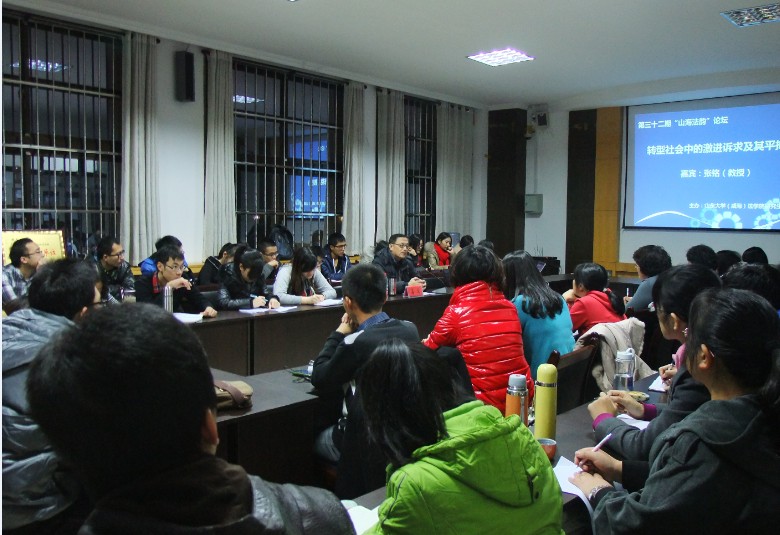 本次论坛由菲律宾欧博游戏官网研究生会学术部的韩佑同学主持。在主持人对嘉宾进行了简介并引入了论坛主题后,论坛正式开始。论坛的第一个环节是张老师针对“转型社会中的激进诉求及其平抑”的演讲。首先,张老师对于相关概念进行了定位,为大家解释了什么是“激进诉求”“转型社会”,指出“激进”是一个相对的概念,“激进诉求”就是站在体制之外的、力图去颠覆体制的一种诉求,“转型社会”则是指我们现在所处的正在走向市场经济的阶段。在明晰了概念之后,张老师分四大方面详细阐述了本次论坛的主题,分别是:转型社会的苦难;转型苦难催化出的激进诉求;理想国追求的宿命---自我异化;对激进诉求的平抑。张老师列举了我们现在所处的转型社会存在的种种苦难,比如社会的无序、分配的不公、贫富差距的扩大、权力的腐败、信仰的流失和道德的滑坡等等诸多现象,并指出这些苦难体现的是一种结构性失范和大面积不满,是产生激进诉求的土壤。张老师为我们阐述了现实生活中由于上述苦难而导致出现的一些激进诉求,比如针对征地和强拆的暴力抗法,指出这些现象虽然是零星的,但是却反映出了很多社会公众对于法律的信任丧失殆尽。之后,张老师把我们引到对理想国的追求的反思中,使我们了解到理想国的追求存在着自我异化的宿命。其还详细分析了这种宿命背后的原因,指出道德理想国的诉求是在把现实描述成魔鬼的同时,也把自己描述成了真理的化身,于是看不到自身的缺陷,难以逃出自我异化的宿命。最后,张老师重点强调了我们应该如何平抑激进诉求,告诉了我们该如何从自律做起,从周围的小事做起。