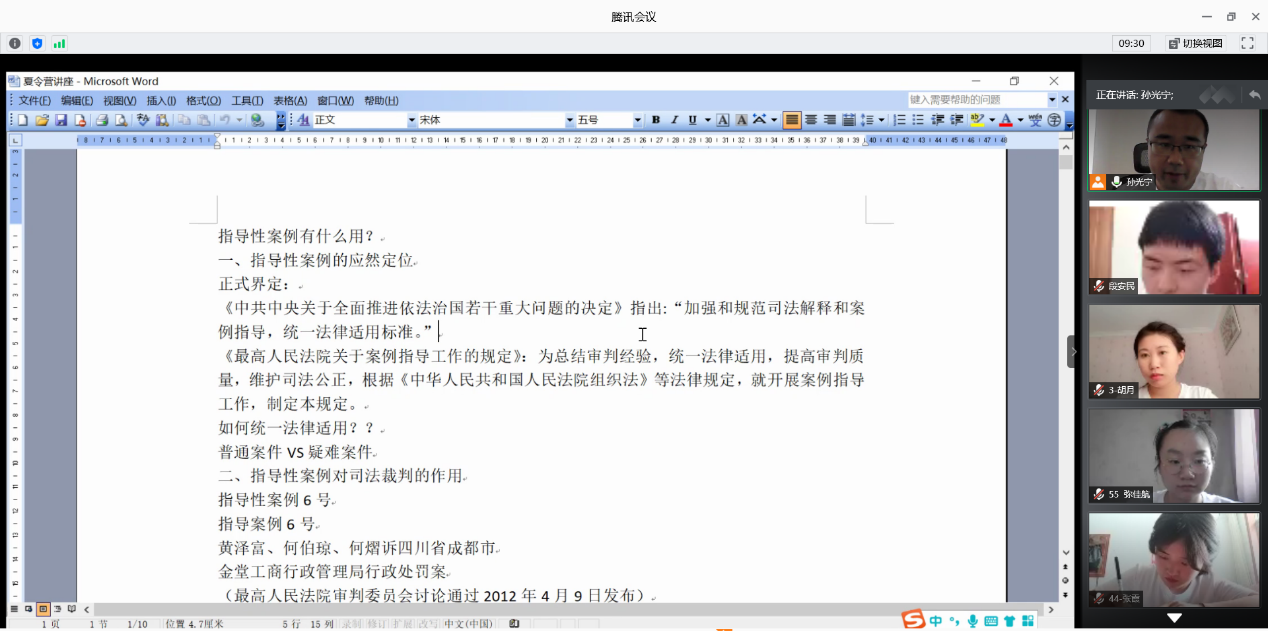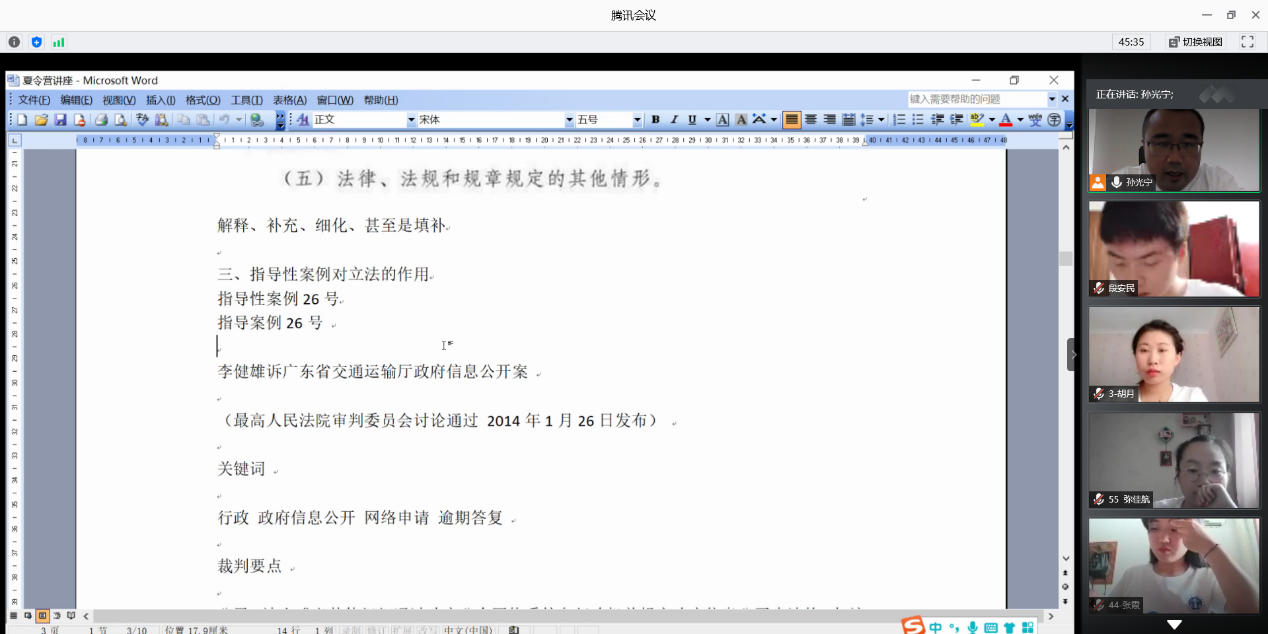 7月9日下午,菲律宾欧博游戏官网教授,博士生导师孙光宁老师为全体营员做学术讲座,讲座的题目是:《指导性案例有何作用?》。孙光宁老师围绕着指导性案例的应然定位,指导性案例在司法裁判中的作用,指导性案例在立法活动中的作用等几个角度深入浅出,旁征博引地对指导性案例有何作用展开了论述。为了让同学们更容易理解,孙光宁老师还以指导性案例6号,26号和101号为例子,深入细致地对这些案例进行了分析,和全体营员一起讨论指导性案例的裁判要点与现实意义。